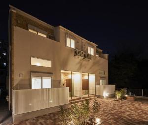 やわらかな間接照明が敷石のアプローチを優しく照らし、植栽の緑を引き立てる夜のエントランス。